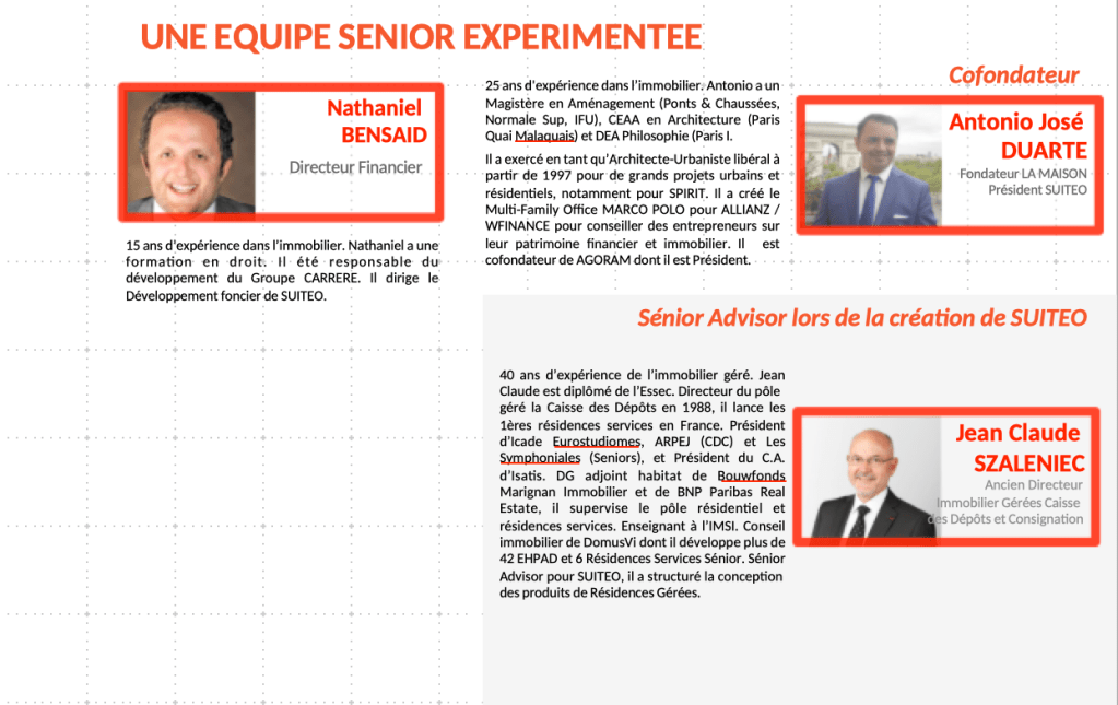 SUITEO Résidences Services a été crée par une équipe expérimentée, conseillée par deux professionnels de l’immobilier géré depuis 40 ans, et complétée par une équipe de spécialistes. Avec un track record d’équipe exceptionnel de +100 Résidences Services, SUITEO Résidences Services bénéficie d’une équipe sénior.